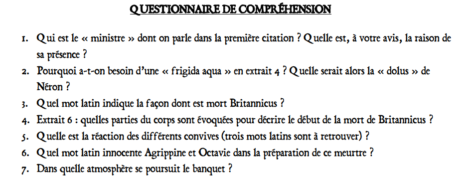 La séance présentée ici s’inscrit dans une séquence consacrée à Néron et à la question : Néron, coupable ou non coupable ? Après un premier chapitre visant la contextualisation historique des faits propres à cet empereur et un deuxième chapitre focalisé sur les figures de Néron et de sa mère Agrippine, le troisième chapitre intitulé "Petits meurtres en famille" propose, dans un premier temps, en lecture-compréhension, un extrait des Annales de Tacite. Ce texte relatant un épisode célèbre, celui de l’assassinat de Britannicus, peut s’avérer difficile, proposé en exercice de version à des élèves de 3e. Le dispositif théâtral permet une première approche de ce texte, levant la complexité de certains passages.