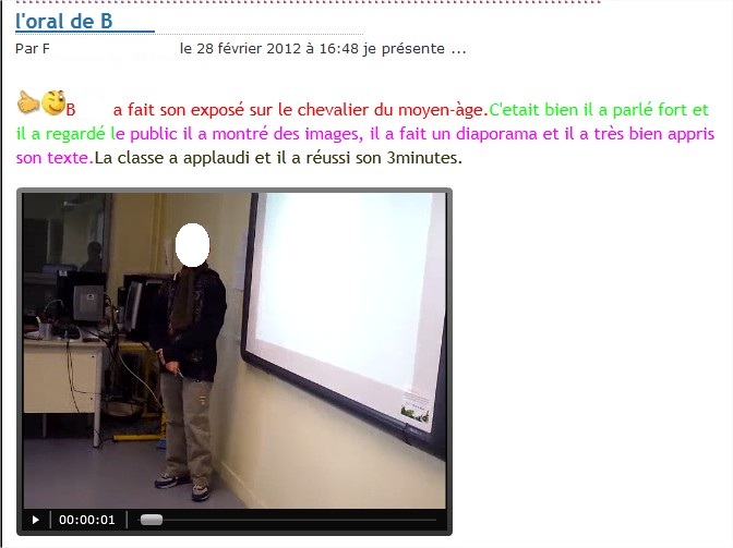 Enfin, l'élève-secrétaire rédige le compte-rendu de cet oral sur le blog e-lyco ouvert dans l'espace-classe et l'enseignante le valide en ajoutant la vidéo. Le blog devient ainsi la mémoire de la classe et sert d'outil de remédiation, de suivi des prestations orales.
