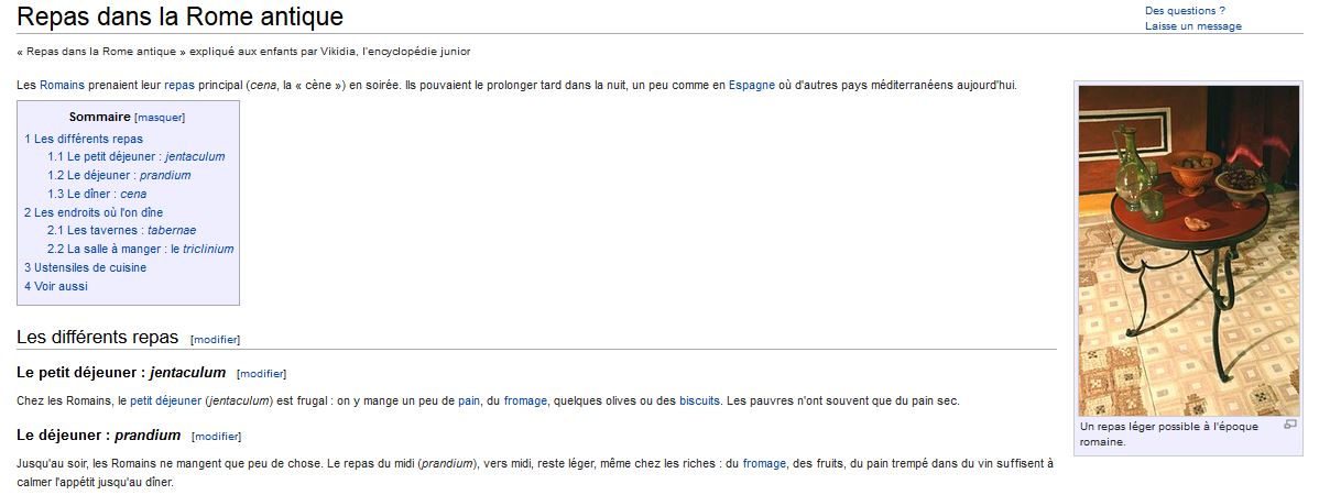 Cette activité a été mise en œuvre dans une classe de 5e latiniste, avec le professeur documentaliste, dans un collège ZEP, en prolongement de la séquence de latin intitulée : "Les Romains avaient-ils les mêmes habitudes culinaires que nous ?". La classe a été divisée en groupes de 2 ou 3 élèves. L'idée initiale était de proposer un support de réalisation différent du dossier ou de l'exposé pour rendre compte d'une recherche documentaire, à des élèves loin de la culture de l'écrit. Le projet de réaliser un article pour le site Vikidia avait également comme objectif de faire prendre conscience aux élèves qu'une publication en ligne pour autrui demande des exigences d'écriture (textes construits, cohérents et ponctués), de sérieux et de précision des sources utilisées.