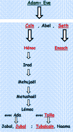 A l'aide d'un texte de la Genèse (chapitre4) (trouvé sur Internet), ainsi que des recherches demandées à la maison, identification des noms propres (Caïn, Abel, Jéhovah, Tsilla, Jubal, Tubalcaïn, Seth, Enoch...) Arbre généalogique de ces « premiers hommes »*