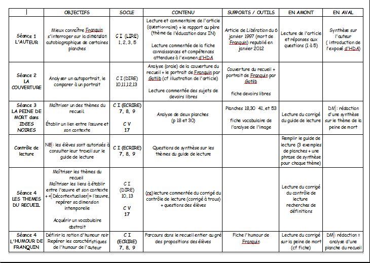 Une séquence qui vise à faire étudier, sous l'angle de la satire et de l'humour noir, l'album "Idées noires" de Franquin. Le parcours combine le travail des compétences de français et l'Histoire des Arts, en donnant les pistes pour un travail interdisciplinaire.