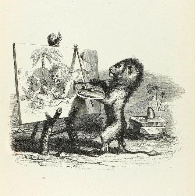 Image, Grandville - Fables de La Fontaine - 03-10 . Le Lion abattu par l'Homme, public domain