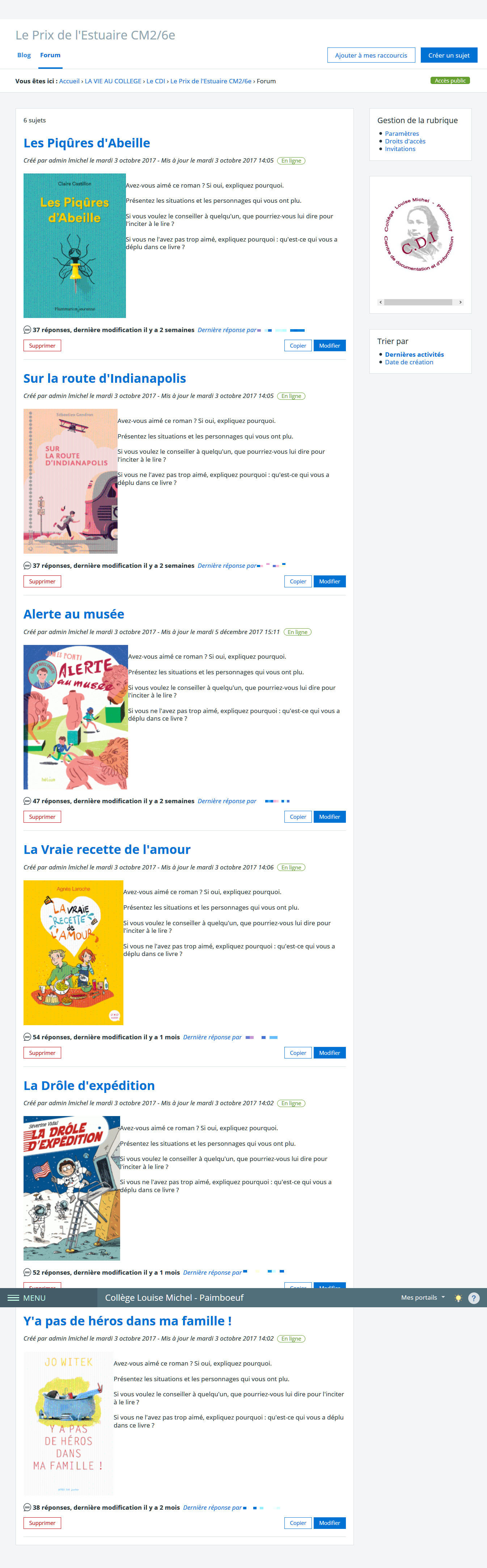 Il s’agit de développer, au cycle 3, le goût de la lecture personnelle et de créer, par l’intermédiaire du forum, des échanges entre élèves d’un même niveau mais aussi avec leurs camarades de CM2 dans le cadre de la liaison CM2/6ème.