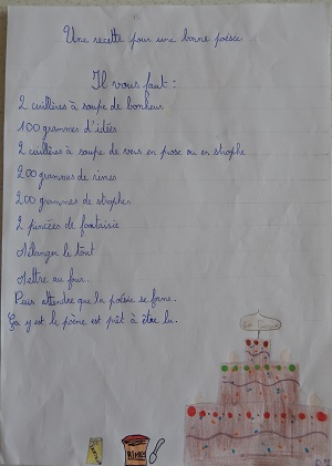 Après avoir étudié ensemble les caractéristiques de la versification et s'être essayé à une enquête poétique pour bien assimiler les éléments techniques étudiés, les élèves ont été mis par groupes mixtes afin de réaliser leur propre recueil de poésie.