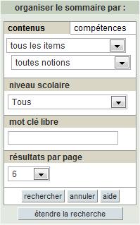 Cet onglet peut compléter l'option "contenus" ou "compétences" mais il peut aussi être utilisé seul, la recherche se limitera alors à un niveau scolaire.