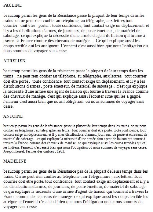 la machine a tendance à écrire le mot "Résistance" avec majuscule. C'est intéressant : Kessel utilise la minuscule dans le texte original. Qui a raison ? La machine ou l'écrivain ? Et toi, lecteur, tu pencherais pour la majuscule ou la minuscule ? Notons sur ce point que l'appli utilisée n'utilise pas la majuscule en début de phrase, faute qui reste difficilement compréhensible, la machine dans le même temps retranscrit fidèlement les virgules et points dictés. Cette absence de majuscule pose problème au correcteur. Combien de points doit-il retirer à la machine ? On peut également, face à cette situation, réagir comme certains élèves qui ont décidé de "retoucher" le texte obtenu en réintroduisant les majuscules en début de phrase et ainsi "aider la machine à ne pas se tromper".