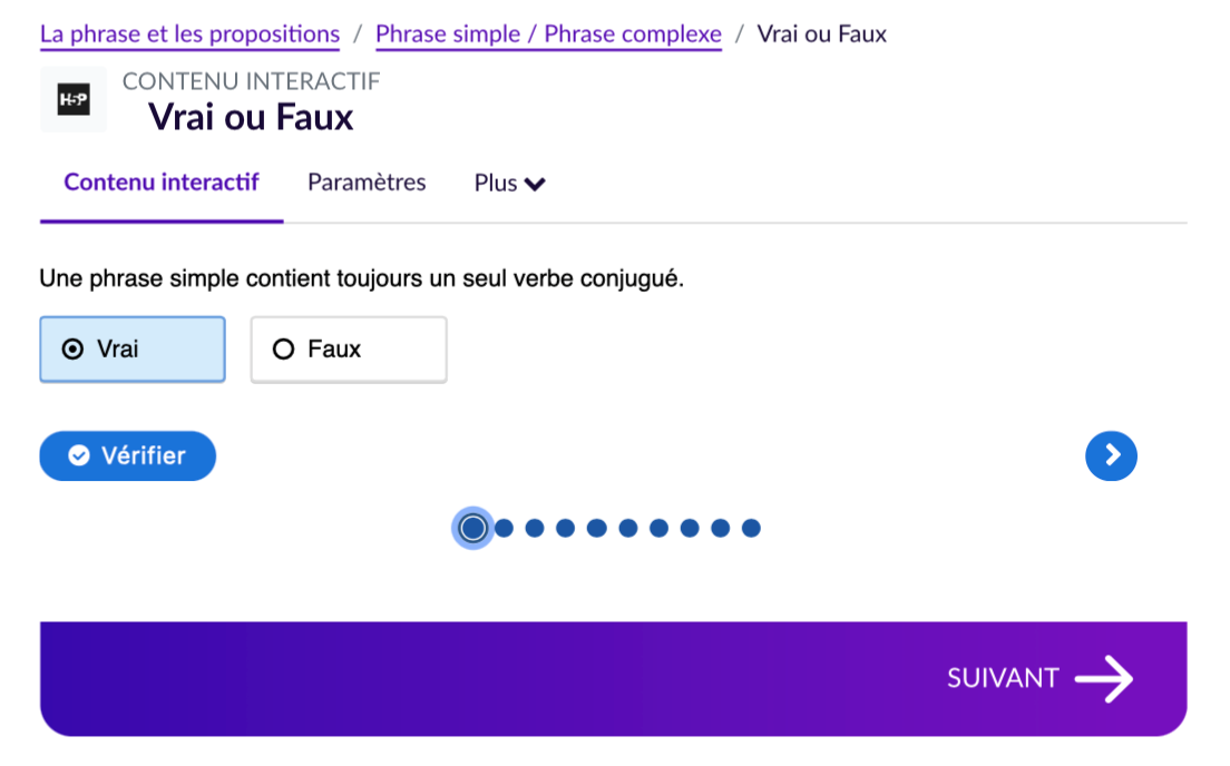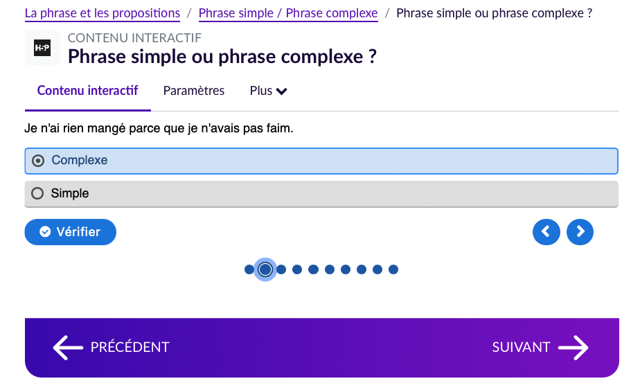 - Tout d’abord un vrai/faux est à effectuer afin de bien distinguer phrase simple et phrase complexe. Dix questions sont proposées du type « Une phrase complexe est composée d'au moins deux propositions » ou « Une phrase simple ne peut jamais être longue ».