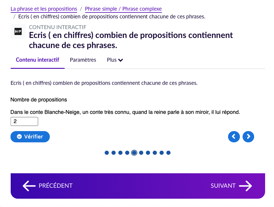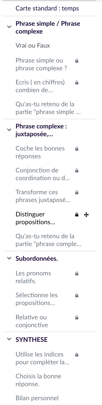 Ce parcours Éléa dont il faut franchir chaque étape avant d’être autorisé à accéder à la suivante, est constitué d’une première partie « révisions » autour de la phrase simple et de la phrase complexe. Cette partie est composée de quatre étapes.