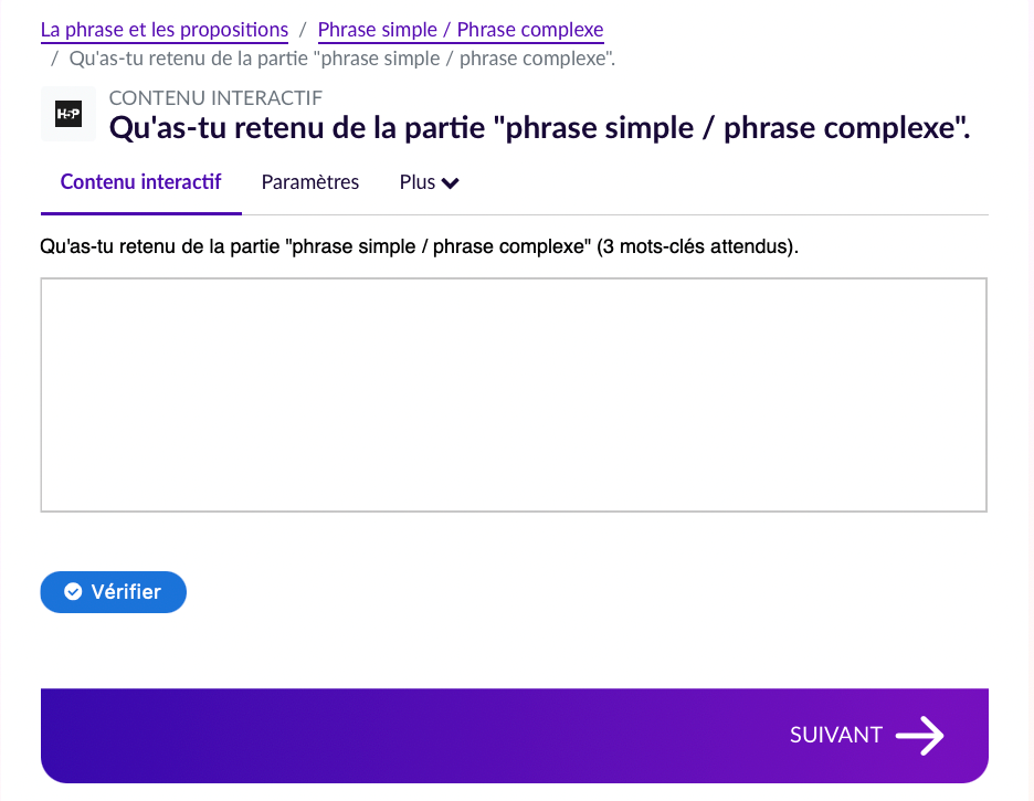 - Enfin, il sera demandé aux élèves, comme dans les sections suivantes, de conclure ce parcours par une trace écrite personnelle. Néanmoins, pour que celle-ci soit validée, trois mots-clés sont attendus (« simple », « complexe » et « proposition »).