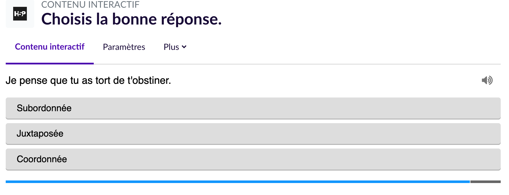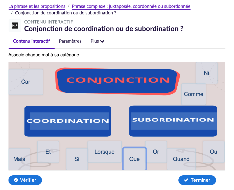 - Un corpus de phrases est alors proposé, les élèves doivent choisir entre trois possibilités : juxtaposée, coordonnée ou subordonnée.