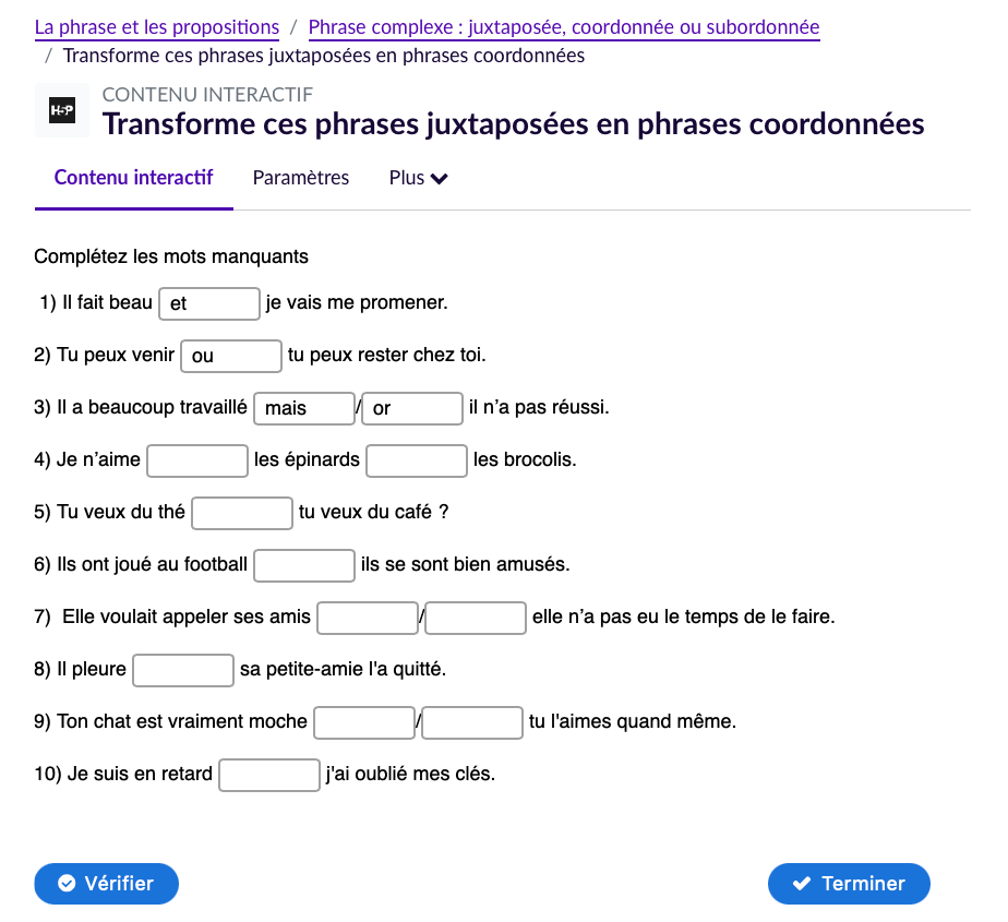 - Un exercice de transformation est ensuite proposé : compléter des phrases afin de transformer des propositions indépendantes juxtaposées en propositions indépendantes coordonnées.