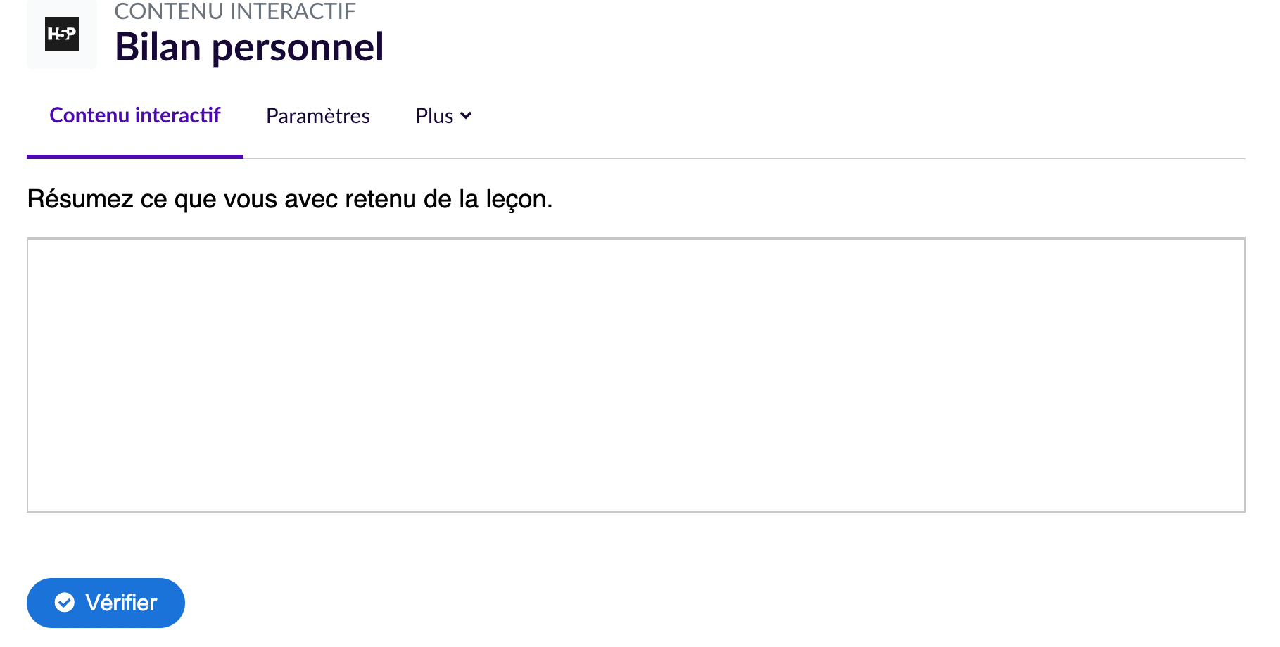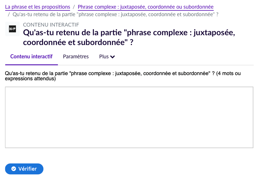 - Enfin, les élèves notent ce qu’ils ont retenu avec l’activité H5P Essay. Dans la consigne, quatre mots-clés sont attendus dans la trace écrite pour réussir : « principale », « ponctuation », « conjonction de coordination » et « conjonction de subordination ».