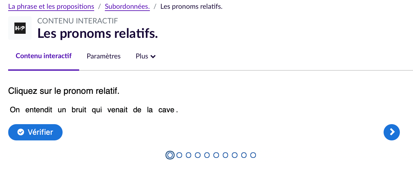 - La première porte sur le repérage des pronoms relatifs : les élèves doivent cliquer sur le pronom relatif dans les phrases proposées.