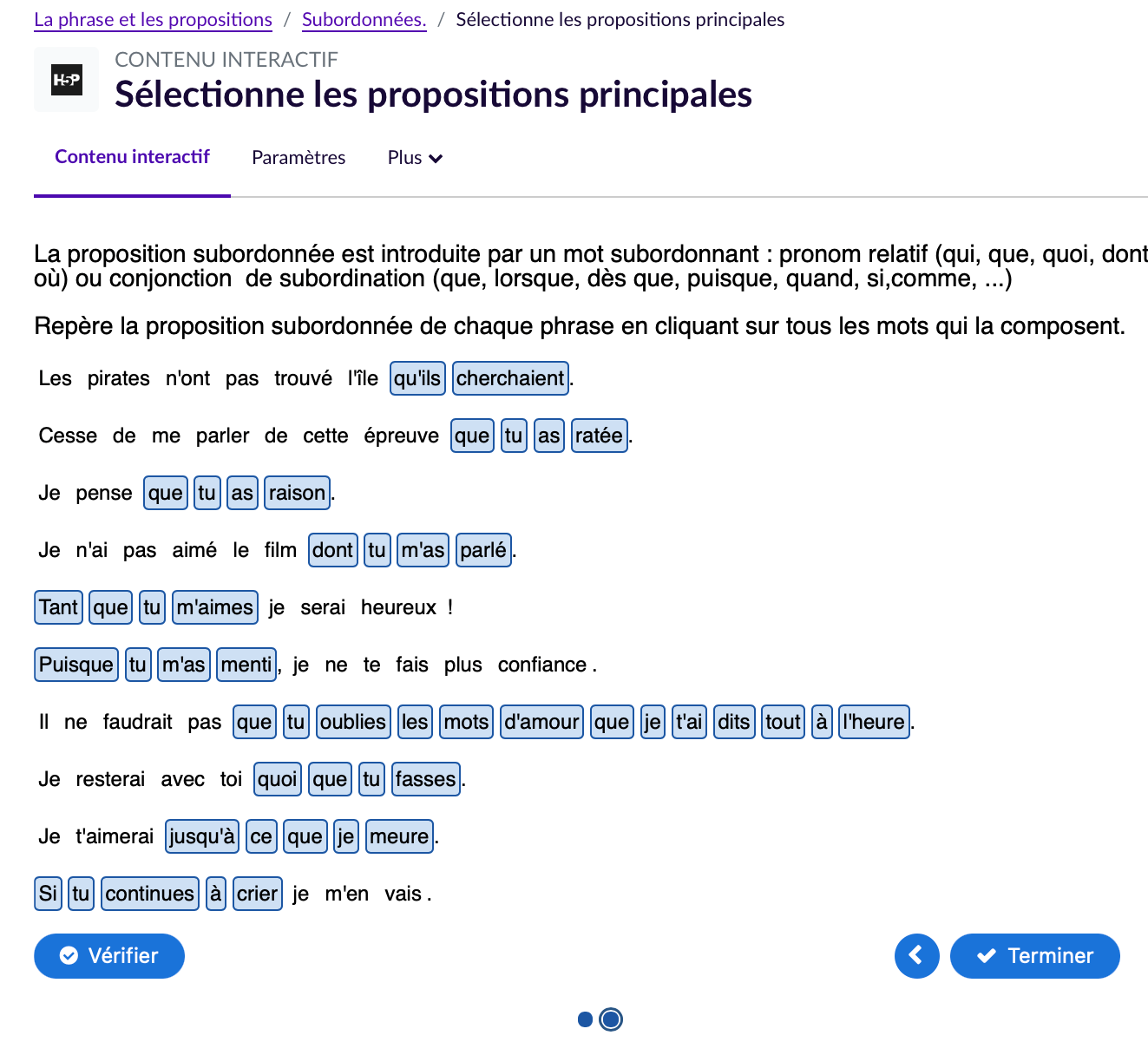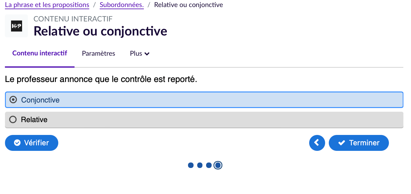 - Dans un second temps, les élèves doivent sélectionner les propositions subordonnées dans les phrases proposées et enfin décider si la proposition proposée est relative ou conjonctive.