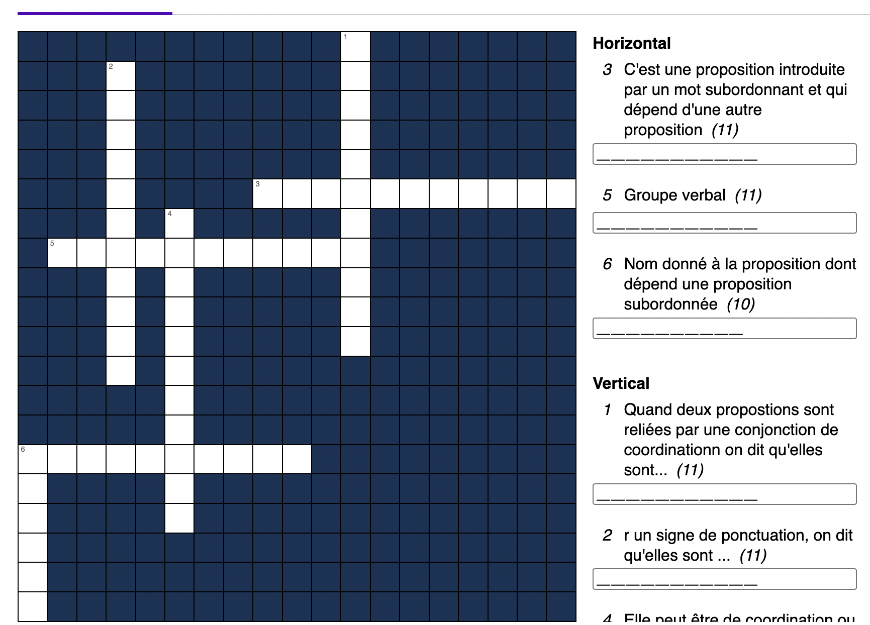 La dernière étape porte sur un bilan du parcours : les élèves doivent dans un premier temps compléter une grille de mots croisés autour des notions importantes de la séance.