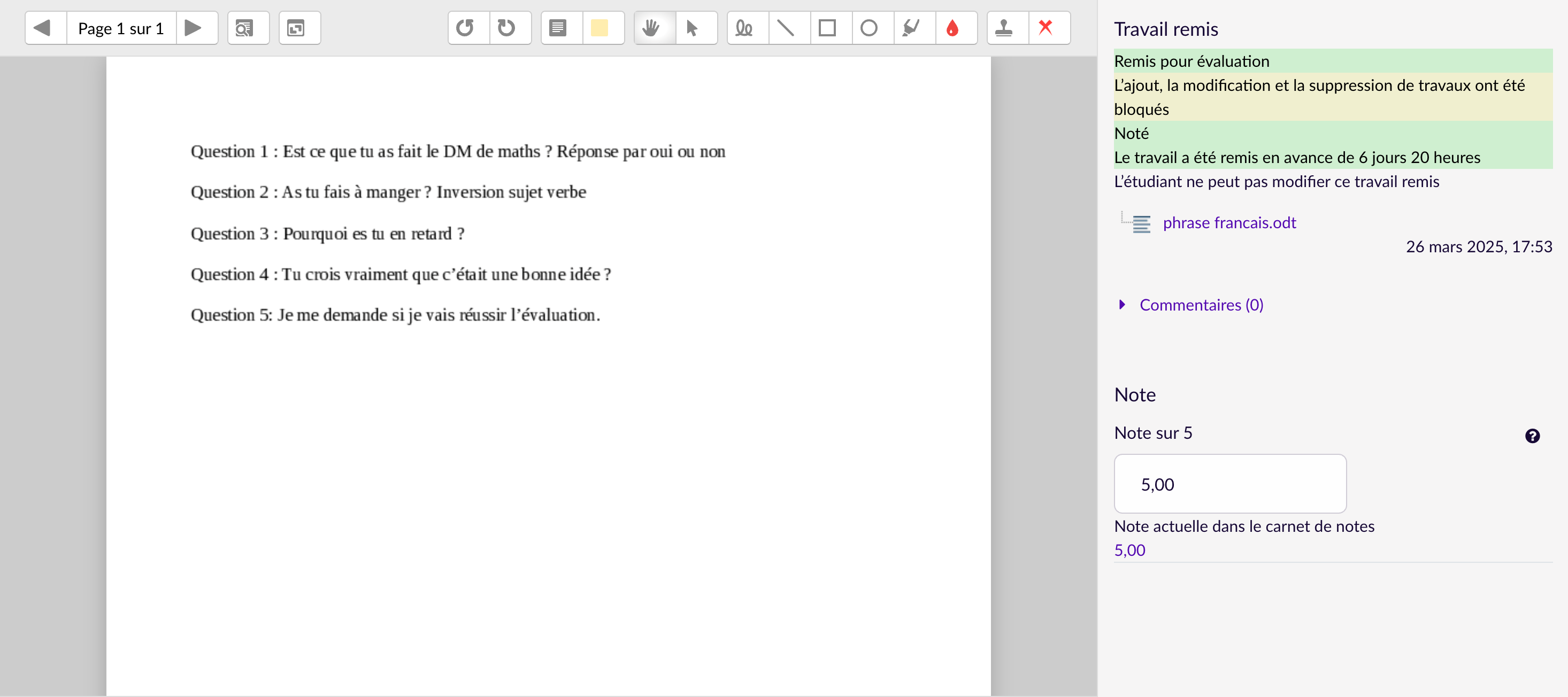 À présent qu’ils ont validé les activités 1 à 3, les élèves peuvent accéder à un document qui recense la totalité des interrogations de leurs explications linéaires. Beaucoup d’élèves sont motivés par l’accès à ce document dont ils pensent qu’il contient toutes les phrases sur lesquelles ils sont susceptibles d’être interrogés à l’examen (il conviendra de les détromper ultérieurement : rien n’empêche d’imaginer une question portant sur une phrase déclarative à manipuler…)