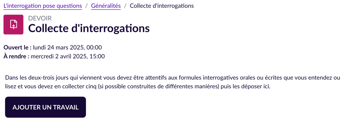 Ce parcours Éléa, dont il faut franchir chaque étape avant d’être autorisé à accéder à la suivante, débute par une collecte d’interrogations de la part des élèves. Ils ont deux jours pour accomplir la consigne suivante : Écoutez / lisez (tous supports) et collectez cinq interrogations de constructions variées. Copiez-les sur un fichier .odt ou .doc ou .pdf que vous déposerez dans l’activité « Devoir – Collecte d’interrogations » du parcours Éléa « Français – L’interrogation pose questions ». On attire l’attention des élèves sur le temps limité : l’activité ne présente pas de grandes difficultés et nécessite d’être réalisée dans un temps bref pour éviter l’effet de dilution et par conséquent la perte de motivation.