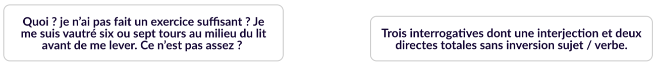 Cette fois, il s’agit de s’approcher de l’exercice canonique de réponse à une question de grammaire à l’oral des EAF. La proposition est la suivante : des interrogations collectées dans les textes de la liste d’explications linéaires des élèves pour l’oral à apparier :