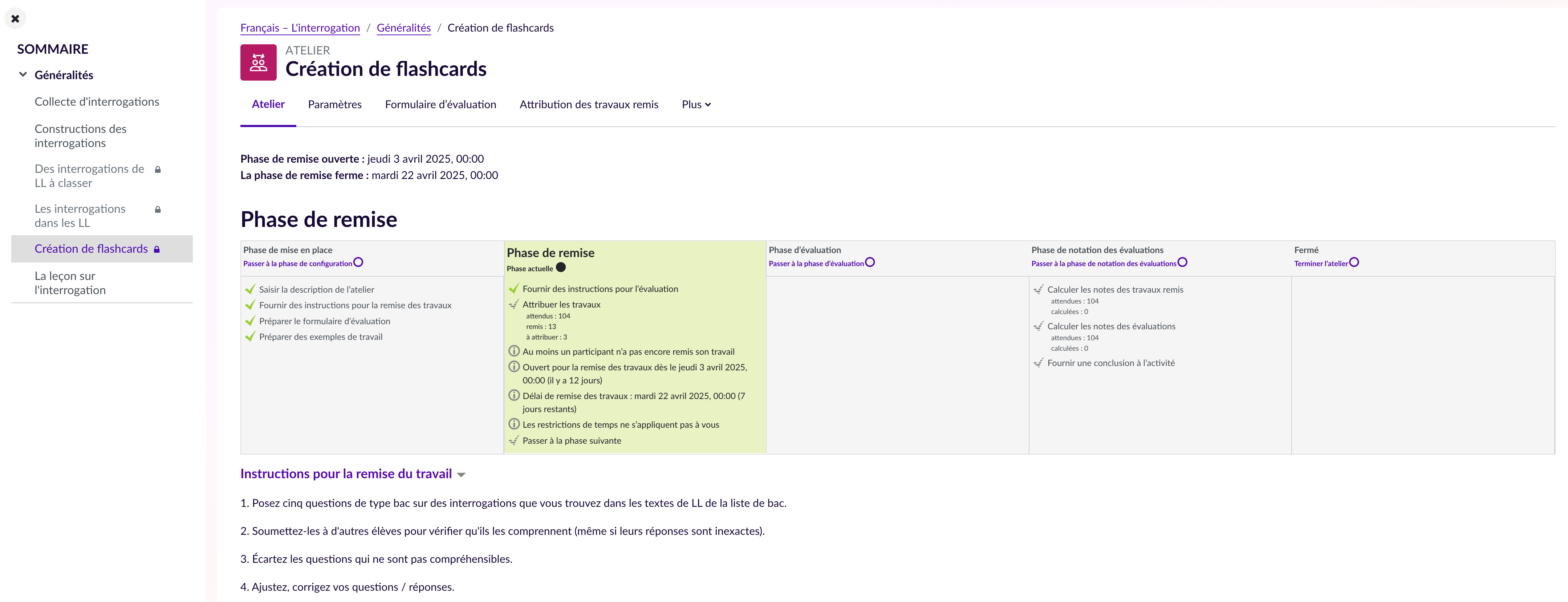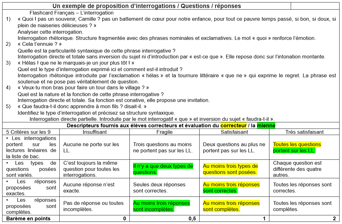 La consigne initiale de l’atelier est la suivante : Parmi les interrogations relevées dans vos explications linéaires, choisissez-en cinq de constructions variées et dans un document à déposer dans l’activité « Création de flashcards sur Éléa », indiquez :