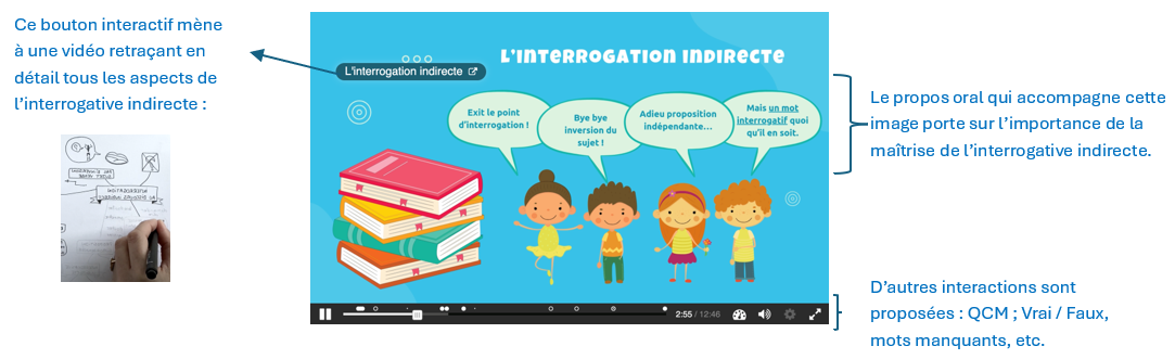 Le parcours est conclu par une ressource en PDF présentant la leçon sur l’interrogation assortie d’exemples pris dans les explications linéaires de la liste des élèves pour l’oral des EAF et une vidéo interactive qui, sur un support différent, reprend la leçon expliquée oralement avec le support des diapositives et des activités de mémorisation des points essentiels.