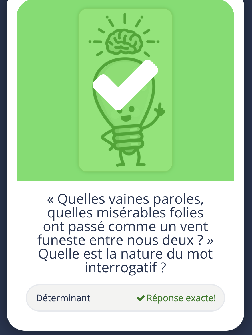 Enfin, comme il repose avant tout sur les interrogations extraites des explications linéaires de la liste des élèves pour les EAF, le parcours leur apparaît comme très utile en leur permettant d’anticiper sur la question de grammaire dont la perception est ambivalente chez beaucoup d’entre eux : négligeable en nombre de points qu’elle rapporte, mais inquiétante par sa difficulté supposée.