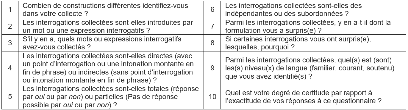 Cette observation prend la forme d’un questionnaire (de l’activité du même nom dans Éléa) en dix points qui amène les élèves à se familiariser avec une observation raisonnée des interrogations, celle-là même qu’ils devront adopter pour formuler une réponse méthodique à une question de grammaire sur cet objet d’étude de la langue.