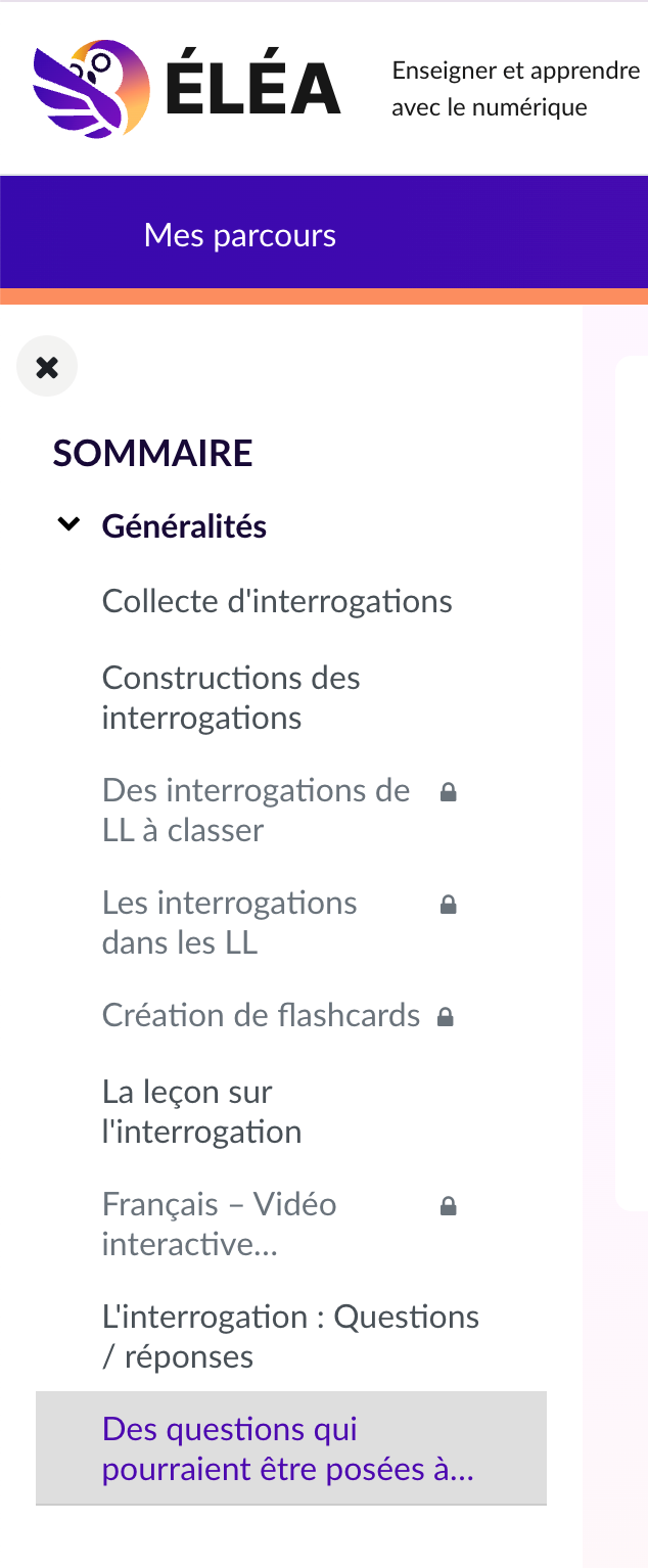 Ce parcours Éléa, construit et testé dans le cadre des TraAM 2024/2025, s’inscrit dans l’étude de l’objet d’étude « L’interrogation : syntaxe, sémantique et pragmatique (classe de première) ». Il succède, aux mois de mars et avril, aux leçons et exercices réguliers sur la phrase complexe et le focus du programme sur les propositions subordonnées conjonctives complément circonstanciel. Il s’agit de se pencher plus spécifiquement sur la syntaxe des interrogatives afin d’en maîtriser la variété et les divers emplois en fonction des contextes. Les supports sont une collecte de cinq interrogations par élèves de constructions différentes les unes des autres et l’ensemble des interrogations des textes étudiées en lecture linéaire qui apparaîtront sur le récapitulatif pour l’oral de l’EAF.