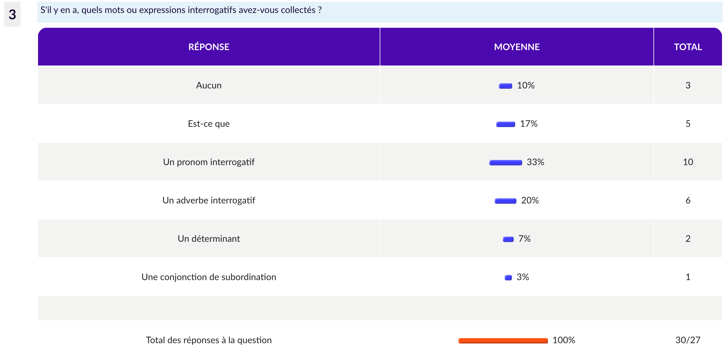 L’objectif pédagogique est moins d’aboutir aux bonnes réponses que de familiariser les élèves avec la terminologie linguistique qu’ils devront utiliser pour répondre à une question sur une interrogation. Néanmoins, réussir totalement l’exercice est une source de motivation pour les élèves qui les amène à porter une réelle attention à la description des différentes interrogations.