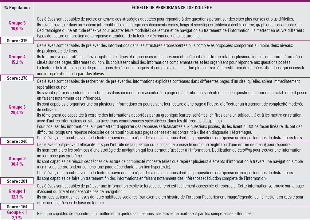 - Les élèves des groupes les plus faibles (inférieurs à 3), qui représentent 45 % de l’échantillon, ne réussissent au mieux qu’un item sur deux. Après une navigation simple, souvent guidée, ils prélèvent et interprètent des informations explicites. Ils sont aussi confrontés aux problèmes de lecture d’informations.