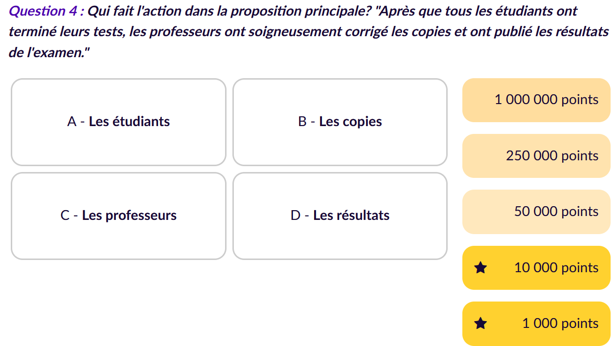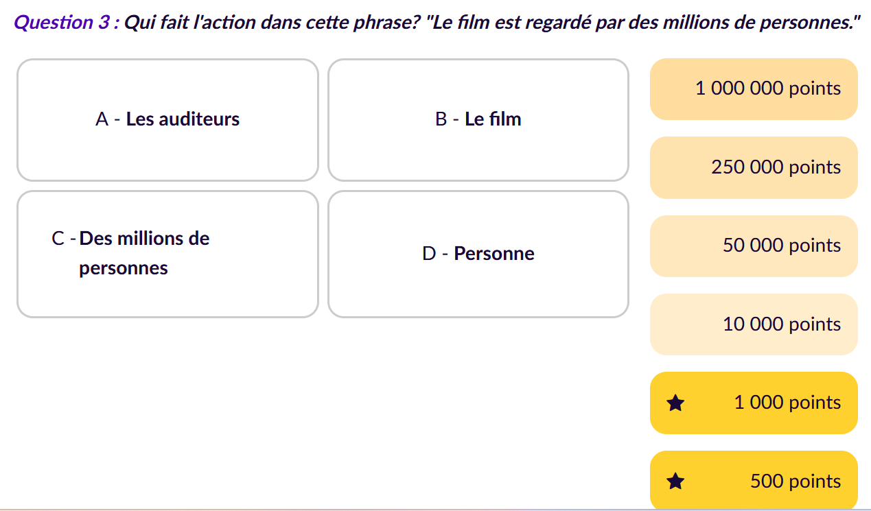 - Activité 1 : Le sujet fait-il l’action ? Il s’agit de réfléchir sur ce qui fonde le sens et un début d’interprétation de la forme passive. Cette activité est proposée sous la forme du jeu du millionnaire. Elle se complexifie au fur et à mesure par le choix des phrases : les premières sont des phrases simples, les dernières sont des phrases complexes. Elle est précédée d’un rappel du cours.