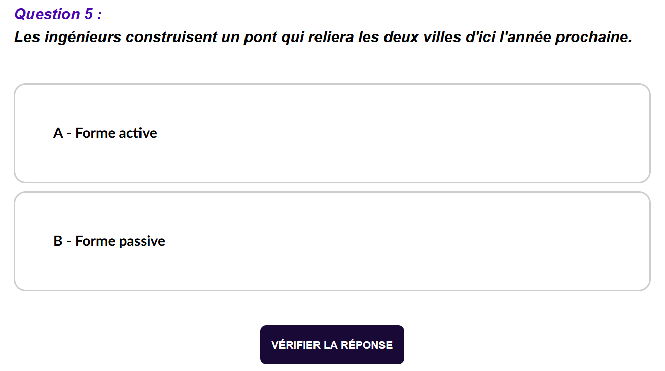 - Activité 2 : Phrase active ou phrase passive ? Cette activité prend la forme d’un QCM, dont les phrases sont aussi de plus en plus complexes. Il s’agit de fixer la leçon.