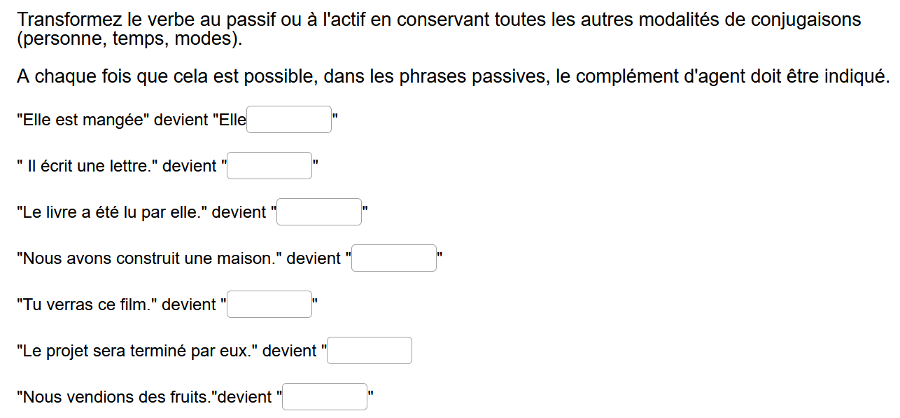 - Activité 3 : Réécritures. Les élèves réécrivent des phrases complètes en les transformant soit de l’actif vers le passif, soit l’inverse. Aucune erreur orthographique ou de ponctuation n’est acceptée. Ce travail rigoureux et précis a fait prendre conscience aux élèves de leur difficulté à ne pas rester dans l’approximation.