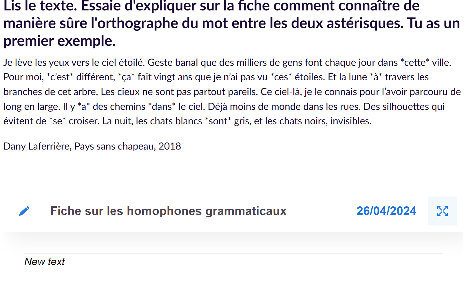 L’objectif des activités dans les sections n’est pas de leur faire faire des exercices systématiques sous forme numérique (les élèves sont le plus souvent mis face à des textes courts), mais d’amener les élèves à adopter des stratégies de relecture efficace et à mieux articuler leur savoir théorique (l’apprentissage des règles grammaticales) et son application. Cette posture de relecture plus active est à nouveau sollicitée quand l’élève prend le rôle d’évaluateur de la dictée de son camarade. L’enseignant a la possibilité d’attribuer les dictées de manière aléatoire ou de manière manuelle.