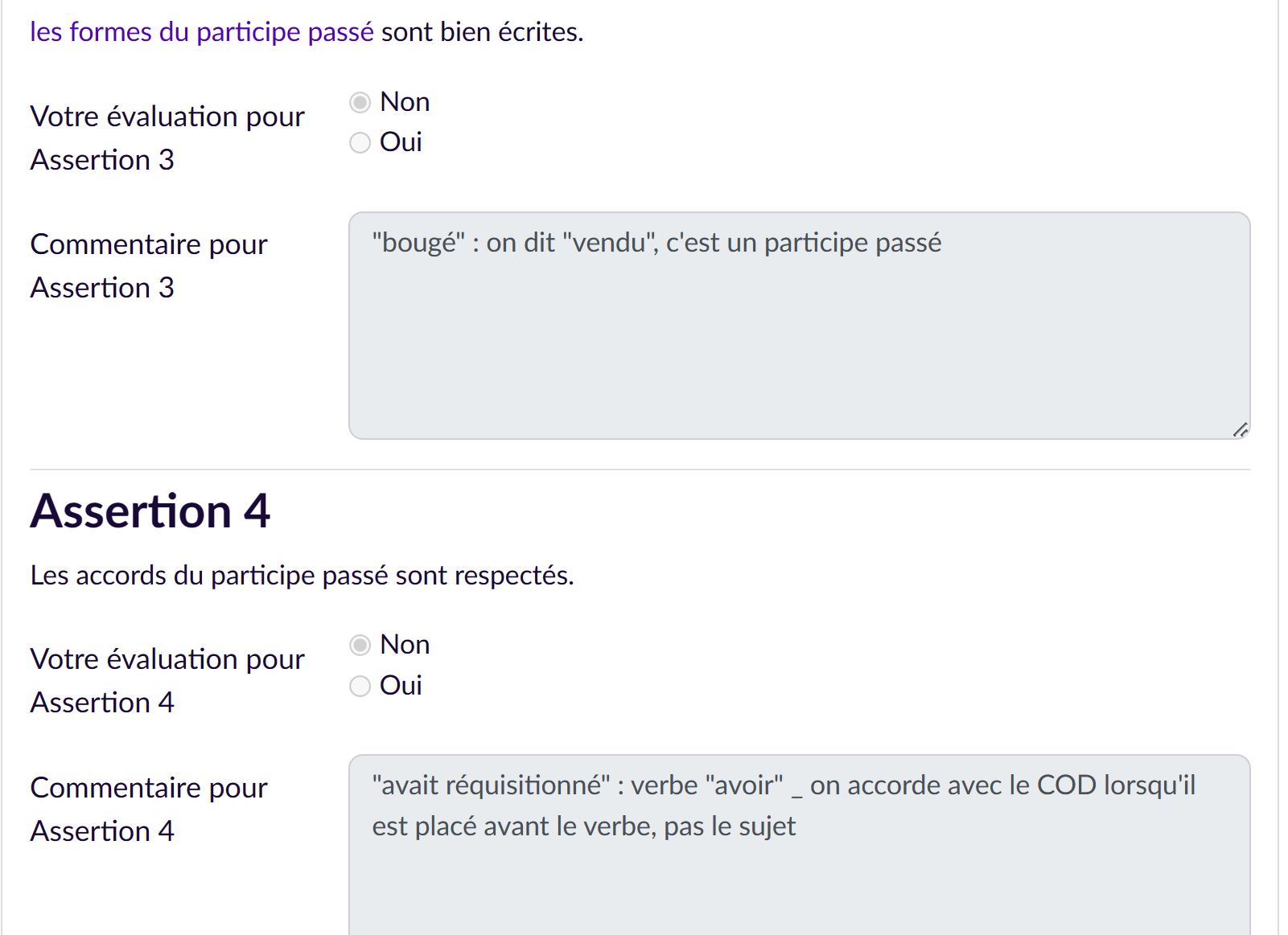 Dans la dernière étape du parcours, chaque élève, équipé d’un casque, réalise la dictée mise en ligne sans correcteur orthographique et remet son travail dans l’activité ATELIER. Les élèves bénéficiant d’un PAP disposent d’un texte à trous à compléter. À l’issue de cette dictée, l’enseignant attribue à chaque élève une dictée à évaluer. Pour corriger la dictée, les élèves réutilisent la typologie d’erreurs vue en amont du parcours : ils sont non seulement invités à relever une ou plusieurs erreurs dans les commentaires, mais aussi à rappeler les règles grammaticales pour éviter de commettre l’erreur.
