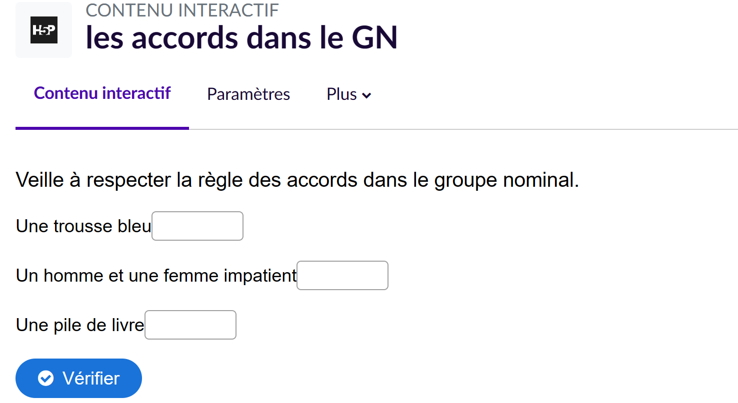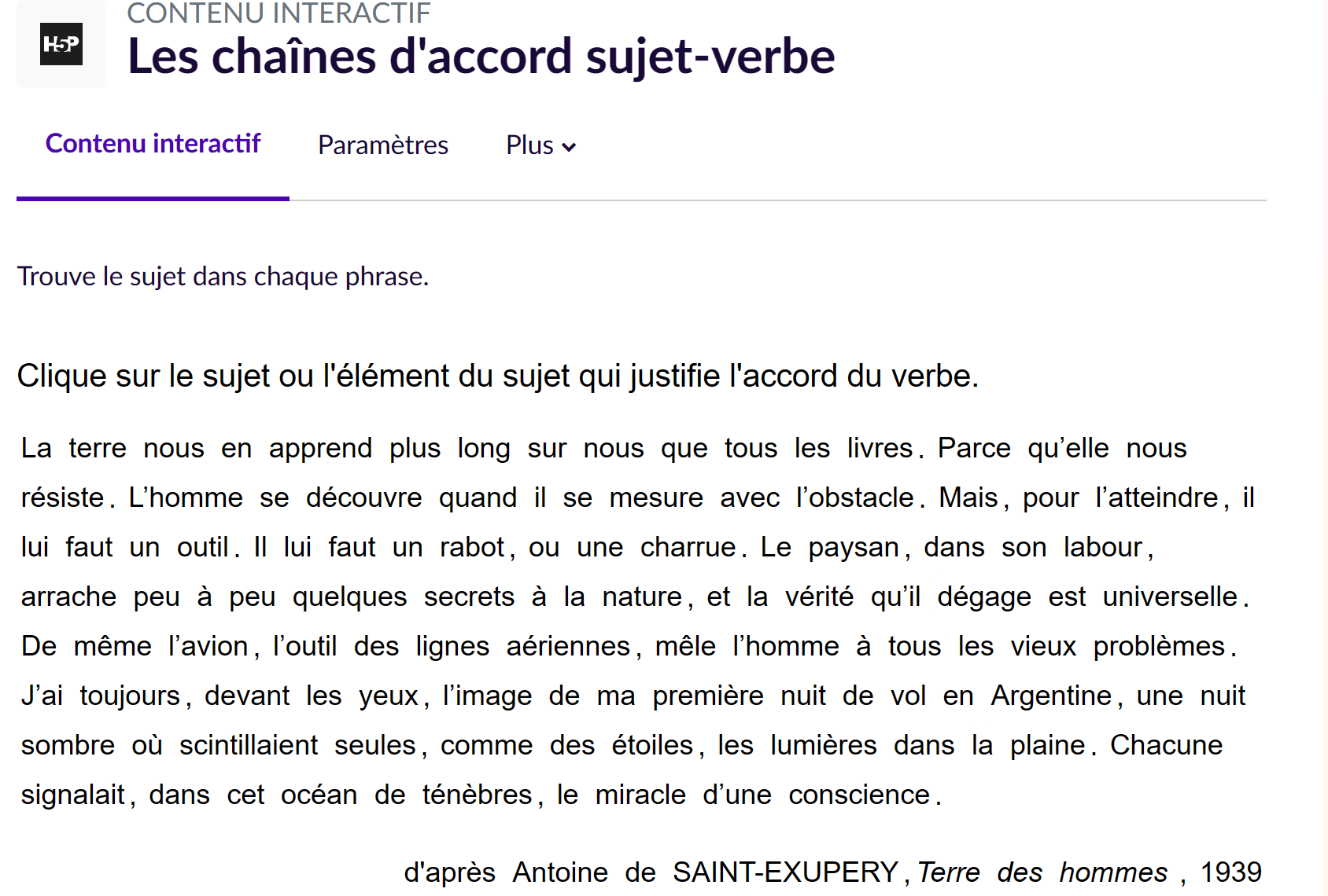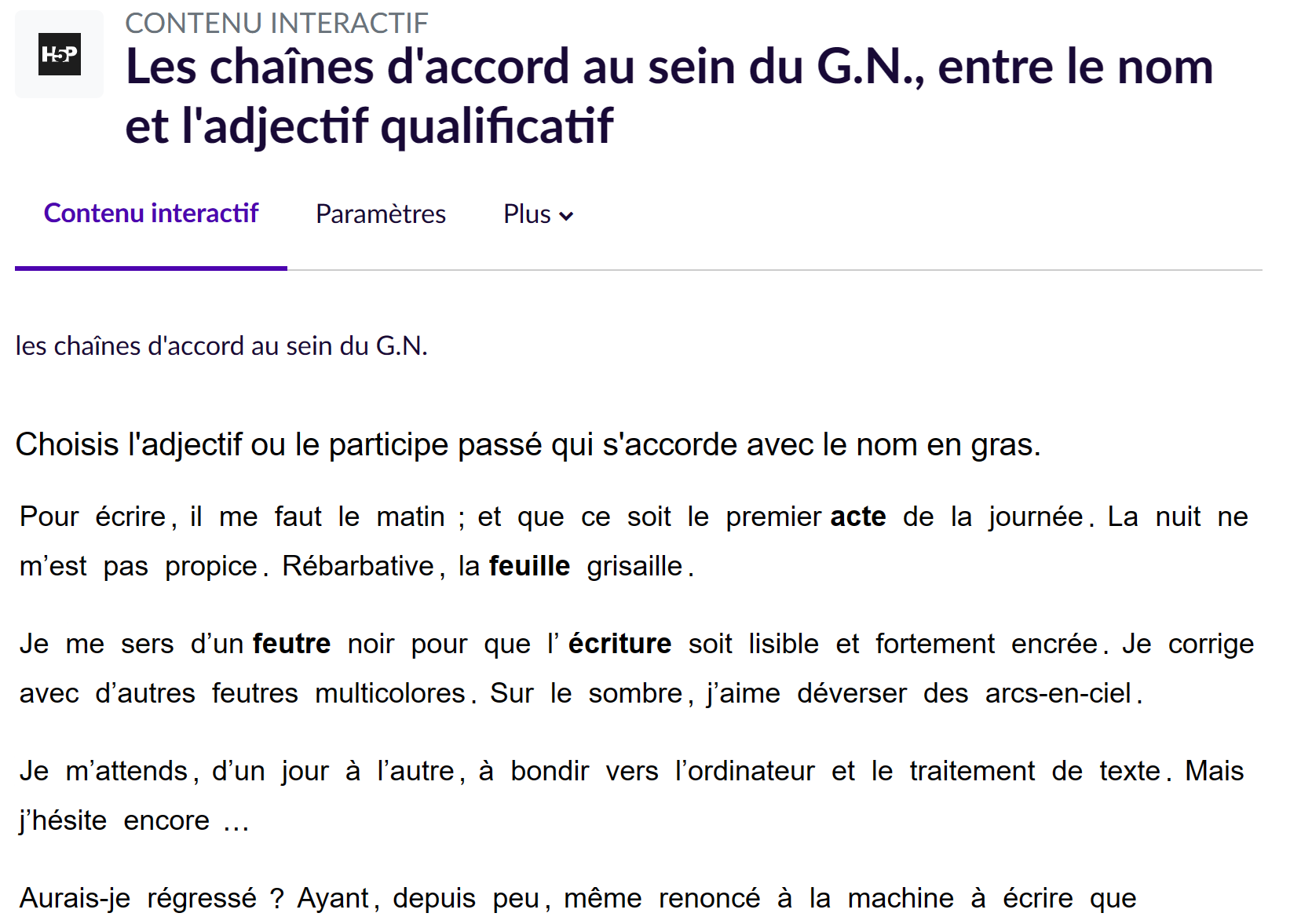 L’activité H5P Fill in the blanks (complète les trous) est centrée sur le groupe nominal. L’élève apprend à porter son attention aux chaînes d’accord grâce aux deux activités H5P Mark the words (marque les mots).