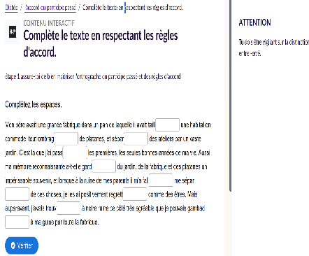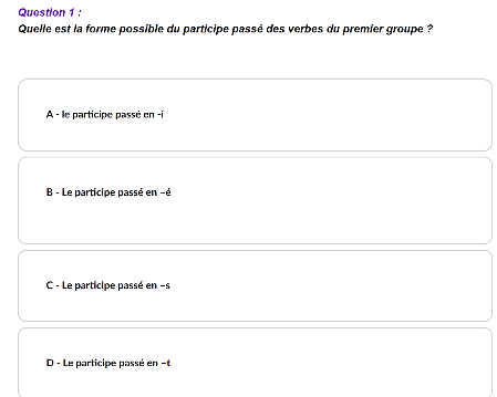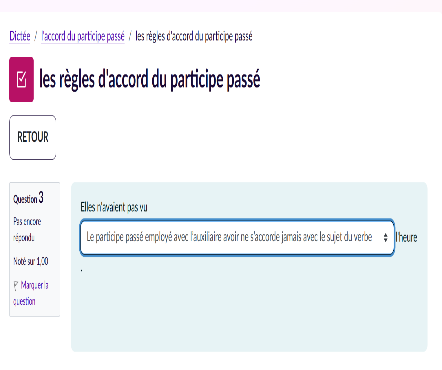 L’activité 1 QCM vérifie que l’élève maîtrise les formes du participe passé. L’activité 2 TEST vérifie la maitrise des règles d’accord avec une relecture de la correction comme restriction. L’activité 3 H5P Fill in the blanks est la mise en pratique des rappels précédents.