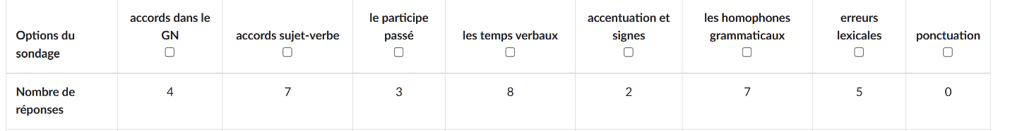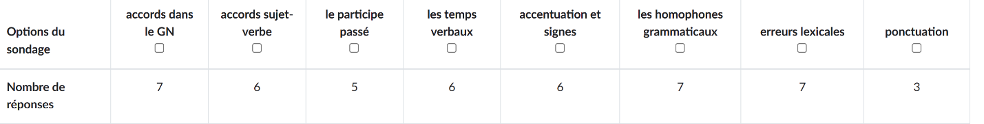 L’activité Moodle SONDAGE propose aux élèves, à partir de leurs copies de dictées, de répertorier leurs erreurs et de cocher les erreurs qu’ils relèvent fréquemment dans leurs dictées.