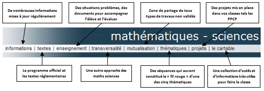 La navigation dans ce nouvel espace pédagogique se fait en cliquant sur les rubriques présentées ci-dessous.