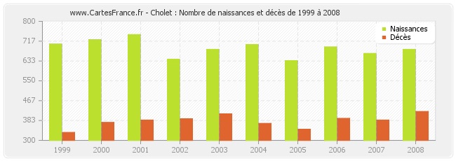 - Cholet en 2008 : 682 naissances et 421 décès