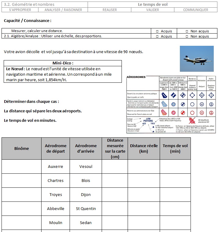 À partir d'une carte OACI (Organisation de l'Aviation Civile Internationale) du nord de la France, l'élève doit déterminer des temps de vols d'un avion allant à 90 noeuds. Cette activité permet à l'élève de mettre en oeuvre les cinq compétences de la grille nationale. Pour les élèves les plus en difficulté, une fiche méthode est mise à leur disposition. Cette activité est également accompagnée d'une grille descriptive qui permet à l'élève de se rendre compte, compétence par compétence, des difficultés qu'il a pu rencontrer.