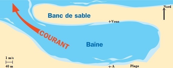 Vous êtes sur le banc de sable et vous voulez rejoindre la plage en traversant la baïne à la nage suivant la direction nord-sud. Vous n'aviez pas remarqué que la marée descendait et vous êtes pris par un courant est-ouest de 3 m/s.