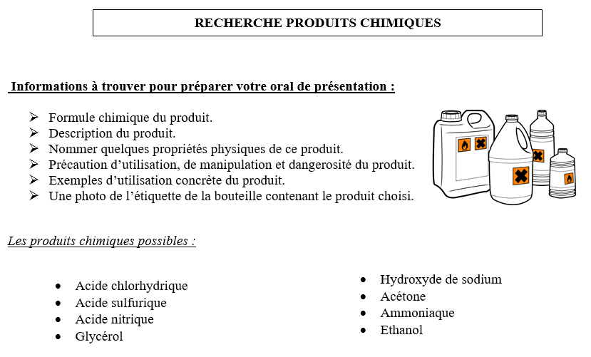 Les élèves doivent réaliser par binôme, une recherche concernant les propriétés d'un produit chimique qu'ils ont choisi dans une liste proposée.
