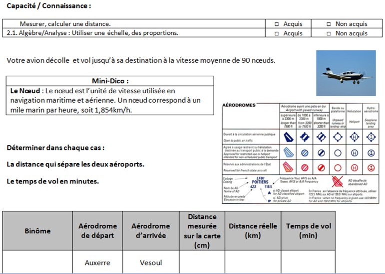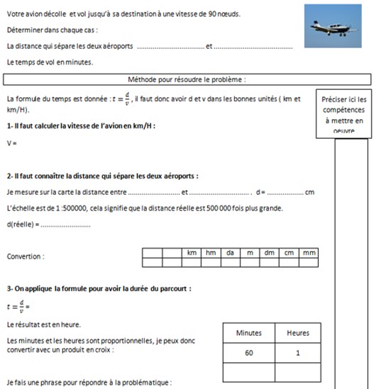 Les élèves cherchent, après avoir repéré les aérodromes de départ et d'arrivée sur la carte, à déterminer la distance entre ces aérodromes. Puis dans un second temps, ils utilisent la formule de la vitesse pour trouver le temps de vol tout en prenant garde d'utiliser les bonnes unités puisque la vitesse de l'avion est donnée en noeuds.
