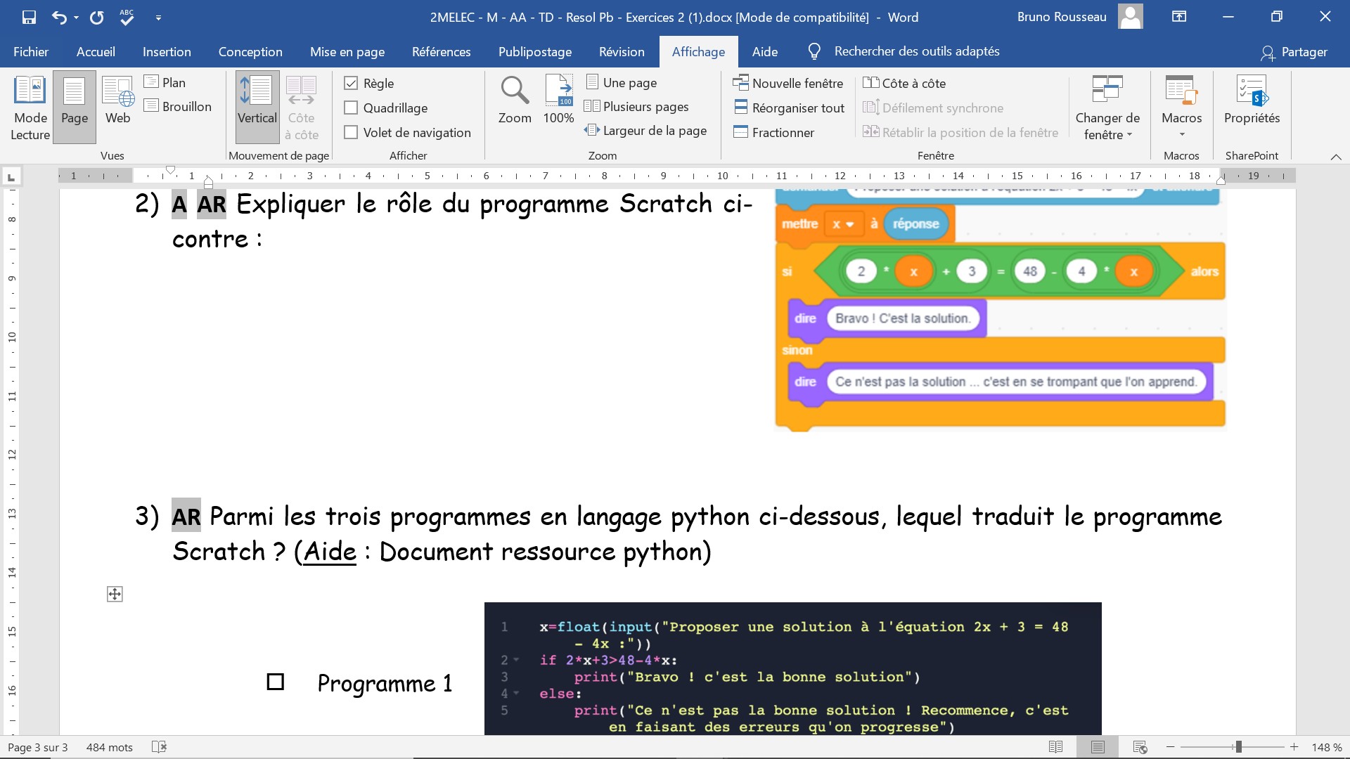 Une situation de TD sur le premier degré et la résolution d'équation. Comment simplement le collègue amène sur un de ses exercices sur la mise en place de l'algorithmie, la liaison entre scratch et python.