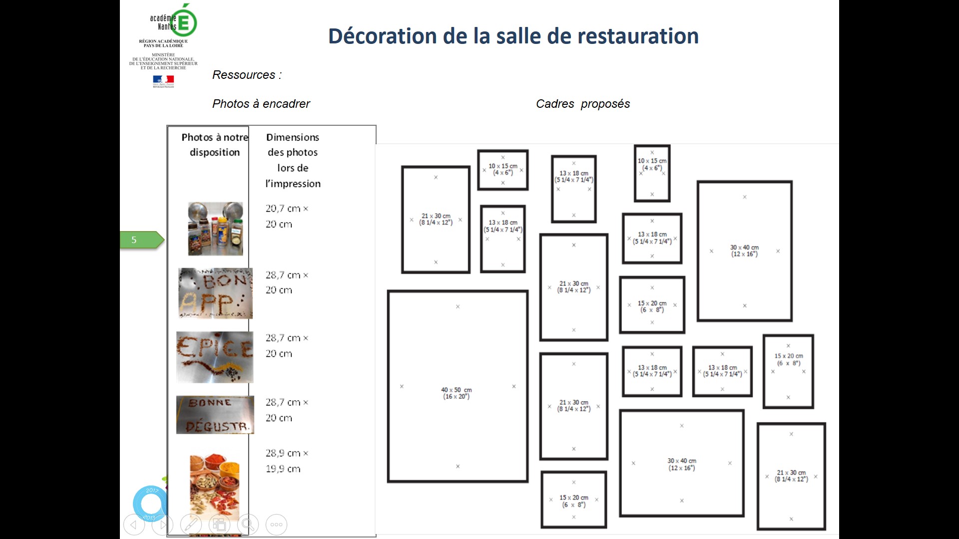 Pour la décoration de la salle : fabrication de cadres de différents formats pour des photos sur le thème des épices (utilisation de la notion d’agrandissement, vérification ludique des pourcentages à l’aide de la photocopieuse )Situation problème 2 :