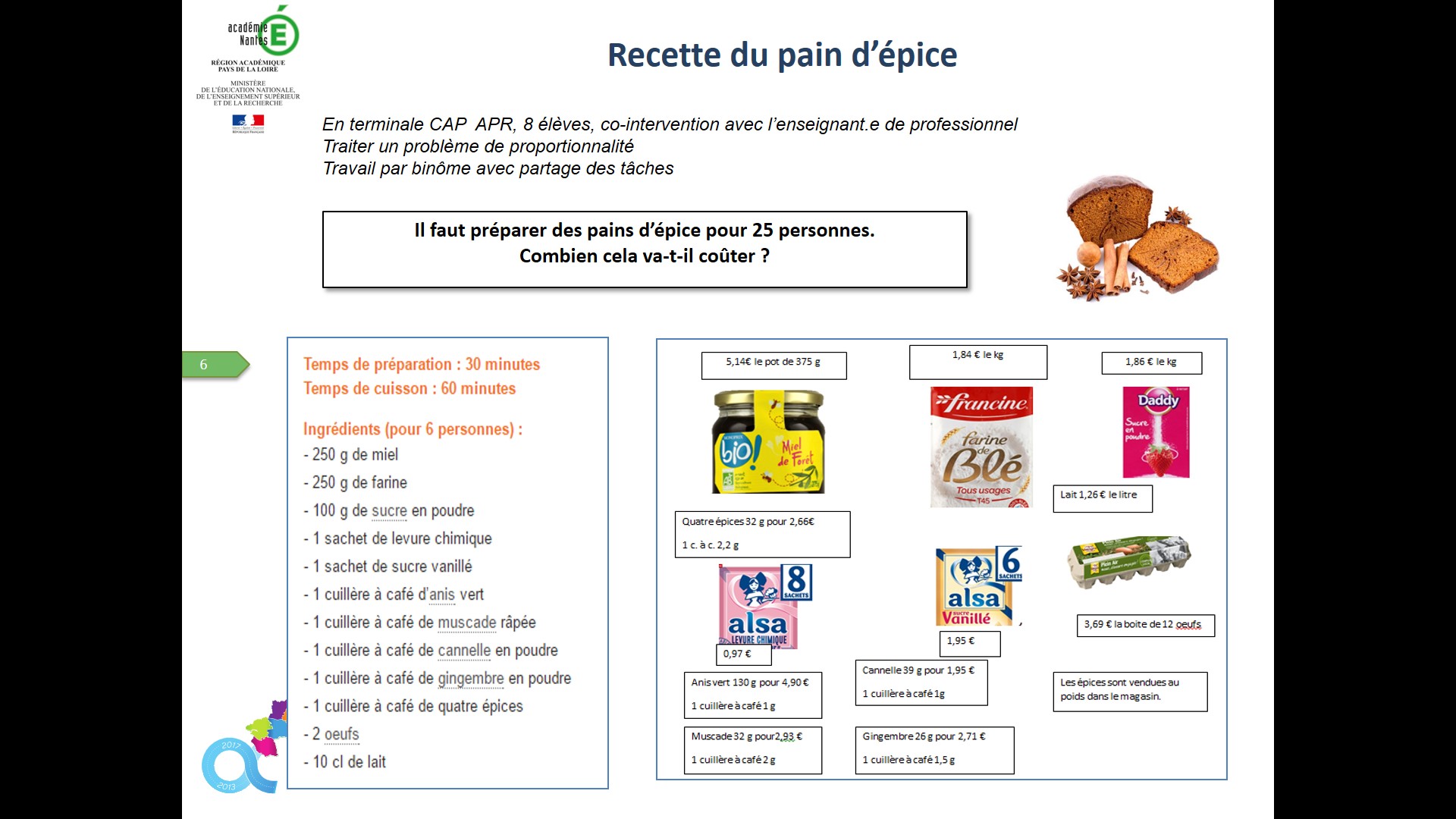 Pour la recette du pain d’épices (utilisation de la notion de proportionnalité, recette pour 6 personnes : trouver les quantités pour 25 personnes)Situation problème 3 :