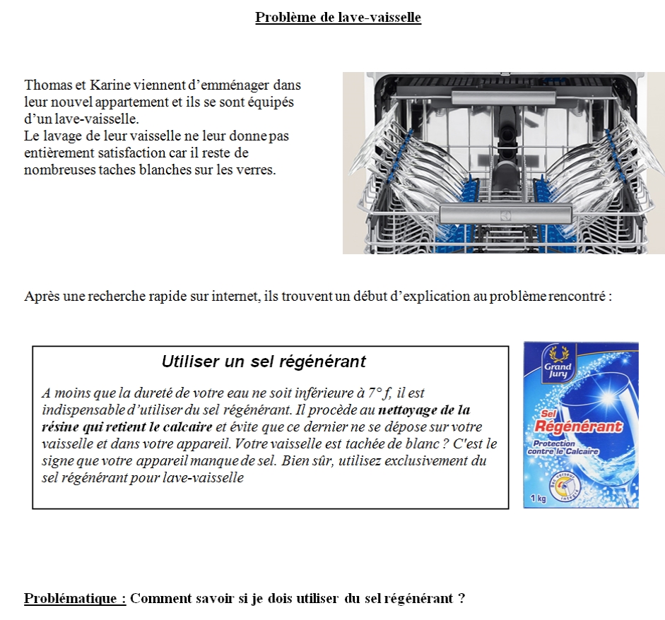 Les élèves doivent conduire des recherches pour savoir s'il est pertinent d'associer un sel régénérant à l'utilisation d'un lave-vaisselle.Objectifs de l'activité: