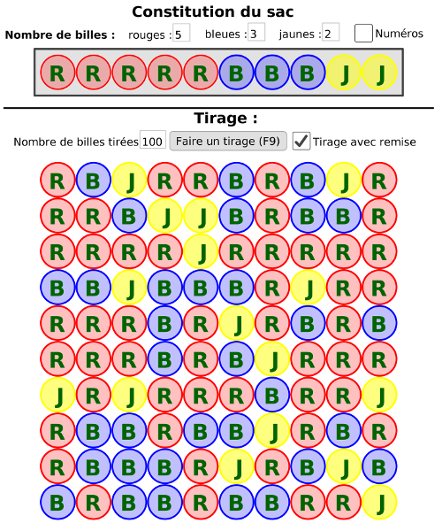 On peut paramétrer le nombre de billes tirées dans le sac et le tirage peut se faire avec ou sans remise.