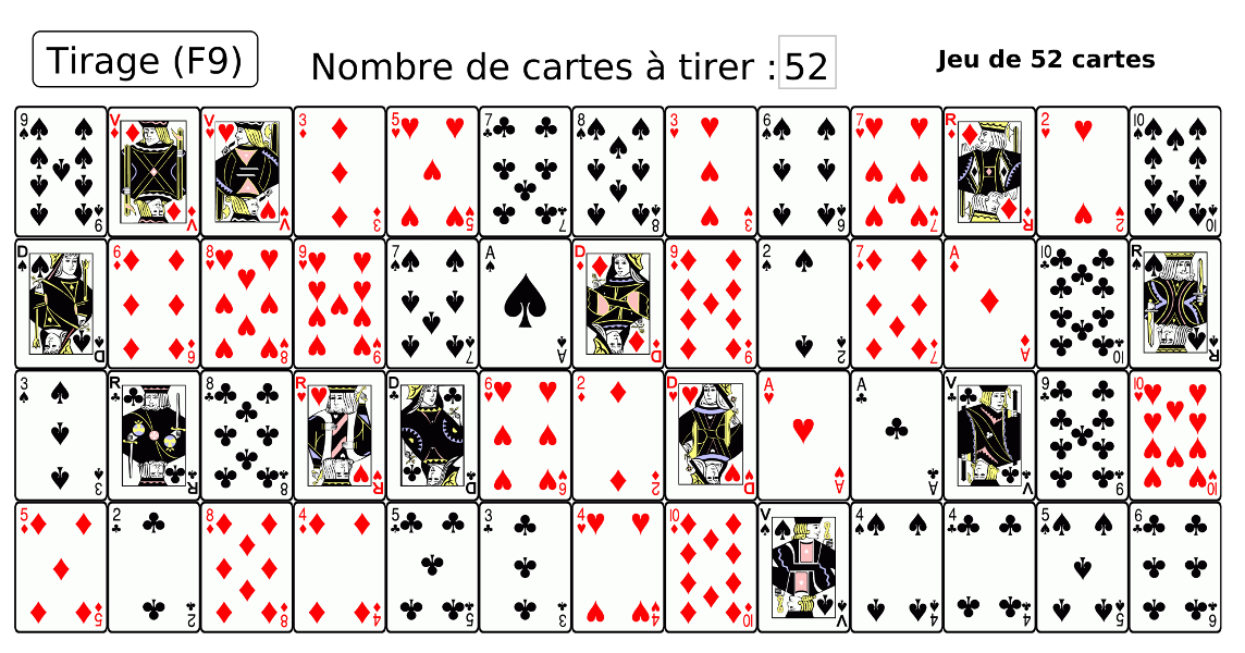 Ce fichier permet de faire des tirages de cartes sans remises. Le nombre de cartes dans le jeu et la disposition de l'affichage sont paramétrables avant distribution aux élèves :