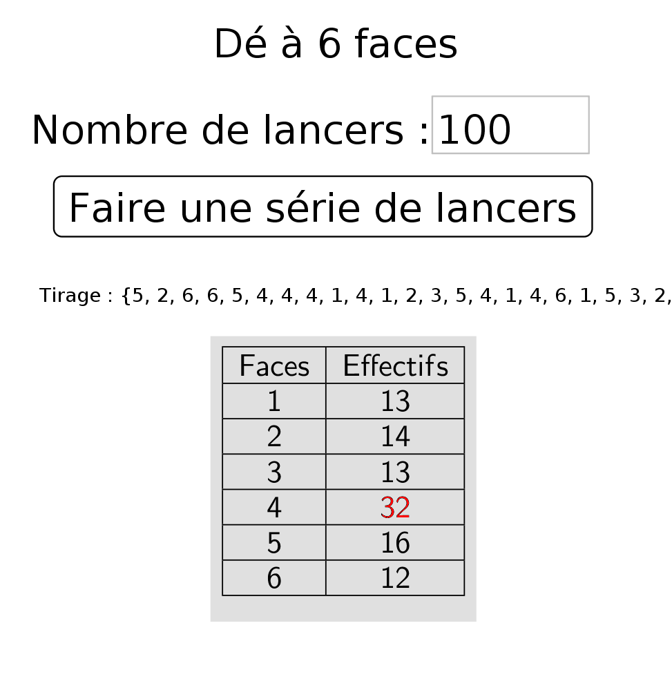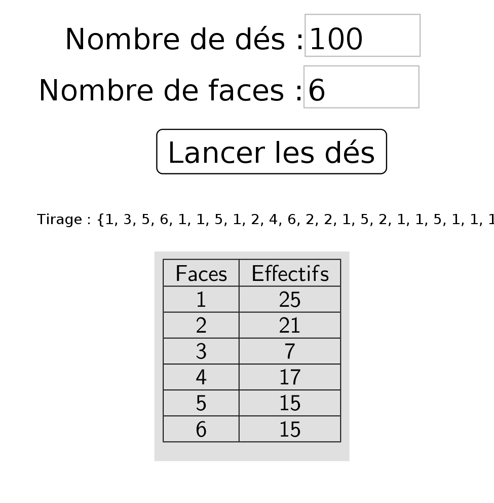 Les issues sont affichées sous forme de tableau donnant les effectifs de sorties de chacune des faces des dés.